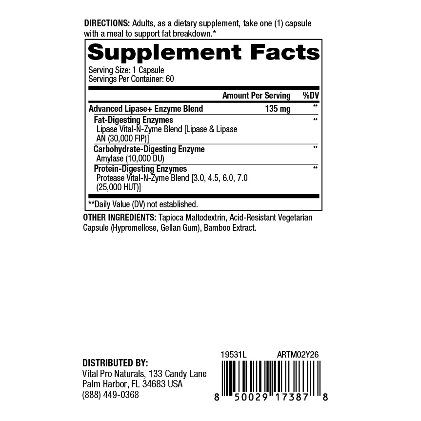 Advanced Lipase+ Enzyme Formula is a targeted enzyme blend designed to support comfortable digestion of dietary fats, especially ideal for lifestyles centered around higher healthy-fat eating styles. Features high-potency lipase at 30,000 FIP for advanced fat breakdown.*